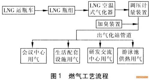 液化天然氣采用LNG鋼瓶儲存運輸,從LNG儲配站運至LNG瓶組氣化站。在站區(qū)將LNG鋼瓶通過金屬軟管與站區(qū)氣、液相管道相連,利用塑摯空的壓力使LNG進入到空溫式氣化器,在氣化器中液態(tài)天然氣氣化并加熱,轉(zhuǎn)化為氣態(tài)的天然氣,經(jīng)過調(diào)壓、計量、加臭后進入站后燃氣主管道,然后分別進入各用氣點,主管及支管管徑均采用水力計算公式講行校核選取。